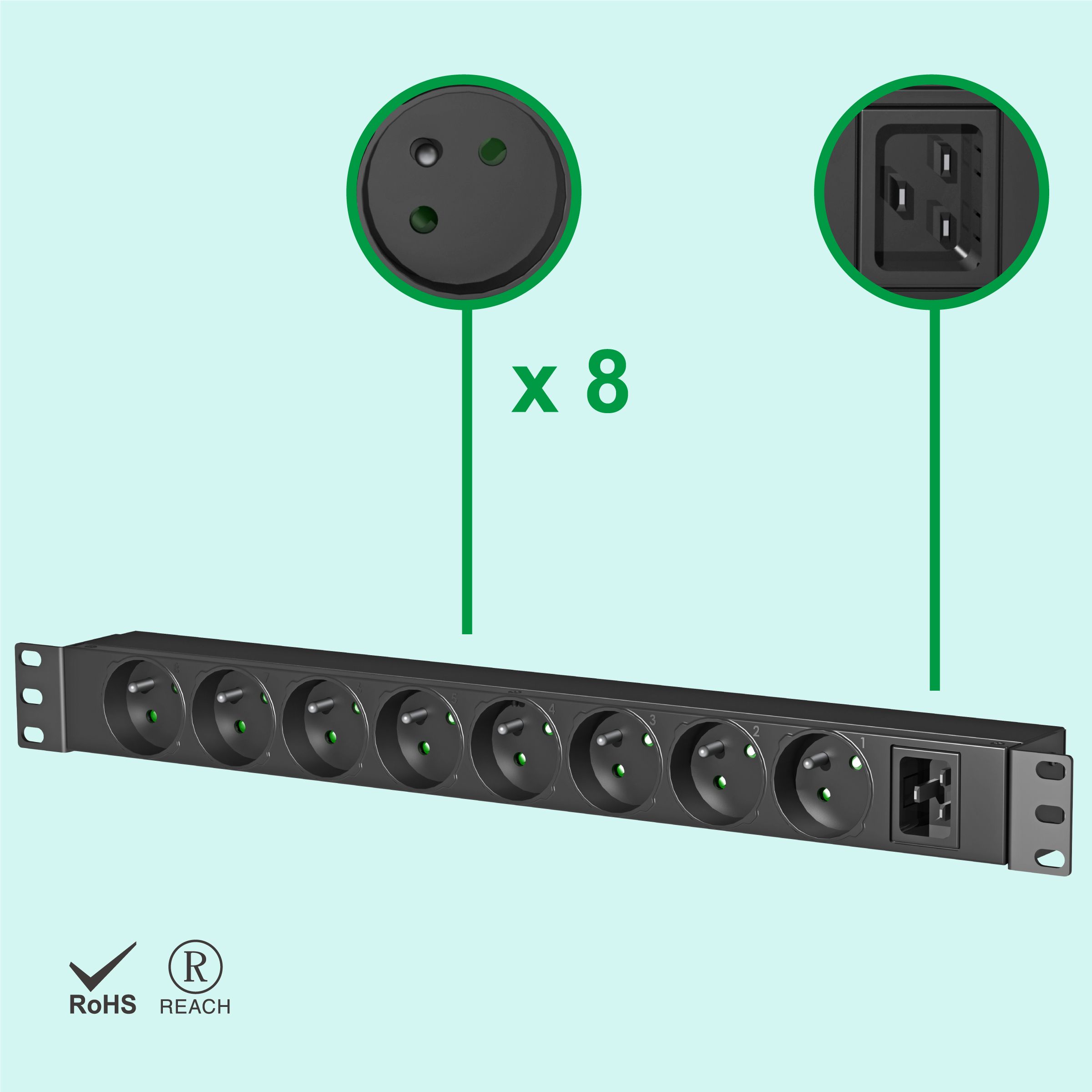 Một PDU 16A 1U 19" gắn rack chuyên nghiệp 8 chiều của Pháp với cổng vào C20 được thiết kế cho tủ mạng và giá máy chủ.